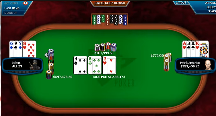 Flop: 4♠ 5♣ 2♥. Antonius apuesta $90.000. Isildur sube a $435.000. Y entonces, el grito digital: all-in. Snap-call.