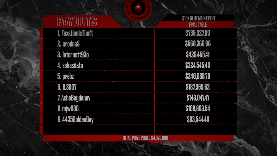 El flop trajo 6♥ 9♦ J♠, ofreciendo a ambos jugadores proyectos de escalera. El turn fue K♠, completando una escalera para “arodnaS”. Sin embargo, el river fue 5♥, completando una escalera mayor para Simon y asegurando su victoria. Con esta mano, Simon se llevó el título y el premio de $736,327.
