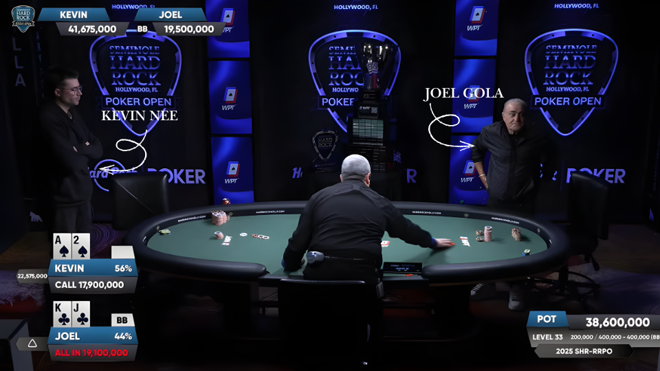 Gola abrió la acción con K♣J♣, fiel a su estilo ofensivo. Nee pagó con A♠2♠, una mano modesta pero llena de potencial.
